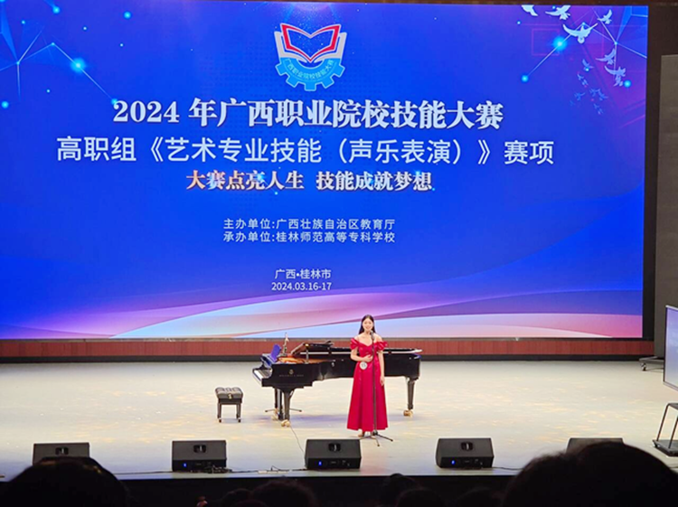 2024年广西职业院校技能大赛(高职组)《艺术专业技能(声乐表演)》赛项于2024年3月16日至17日在桂林师范高等专科学校举行,各校共有24支队伍参赛。beat365教育学院覃小密老师指导艺术教育(音乐方向)专业陈佳琪同学参加了此次比赛,陈佳琪同学努力奋进,最终荣获《艺术专业技能(声乐表演)》个人赛三等奖。