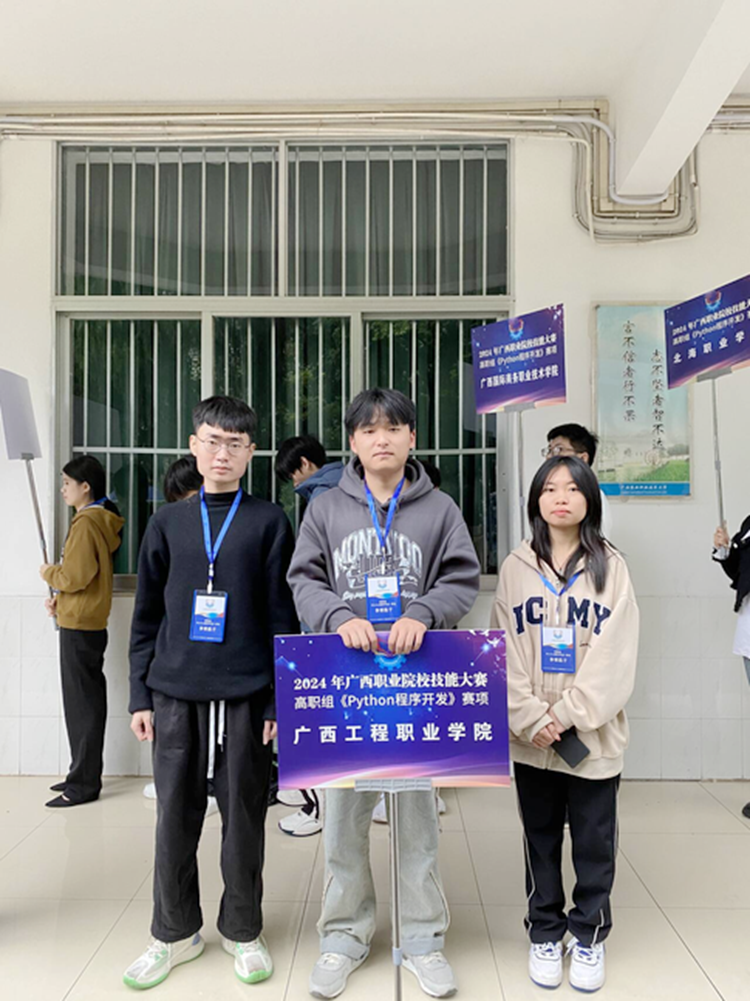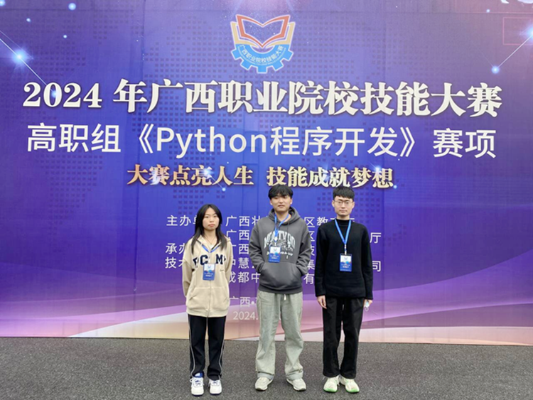2024年广西职业院校技能大赛(高职组)《Python程序开发》赛项于3月9日至3月10日在广西农业职业技术大学举行,各校共有35支队伍参赛。beat365汽车与机电学院韦语赛老师指导大数据技术专业郭香虹、邓平均、翁泽灿同学参加了此次比赛,其中2022级大数据2班郭香虹同学荣获《Python程序开发》个人赛项三等奖。