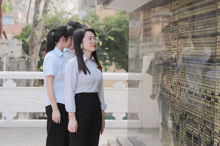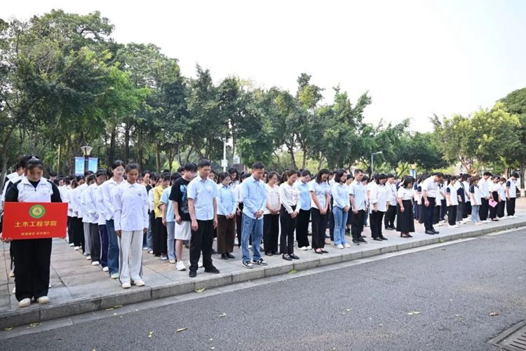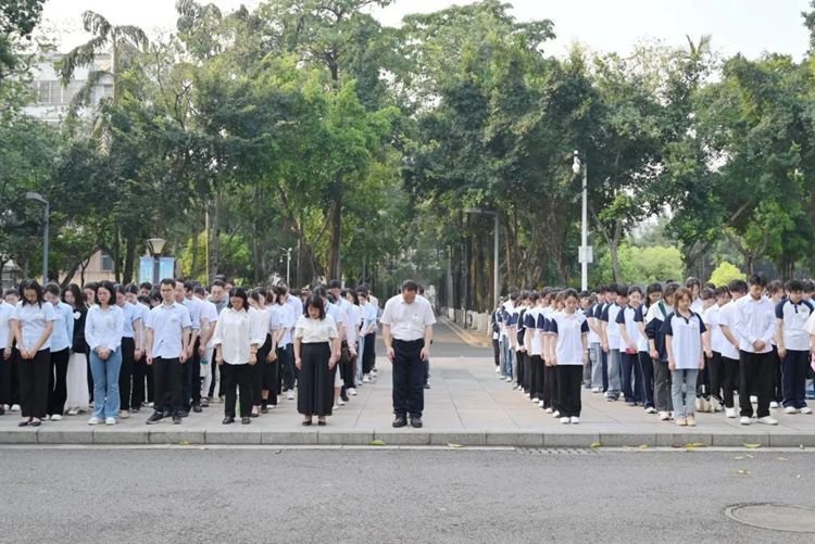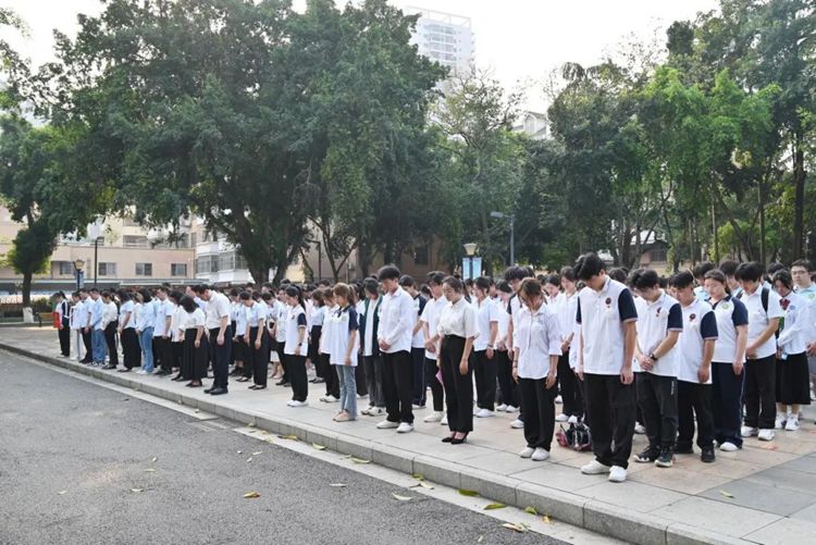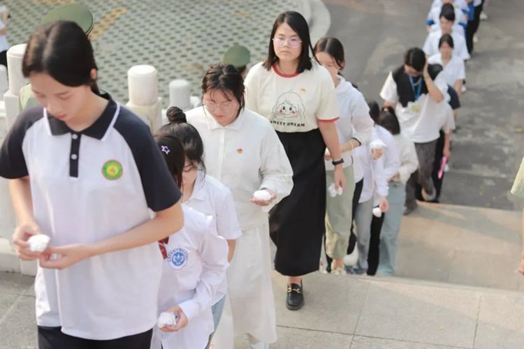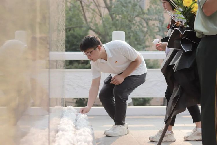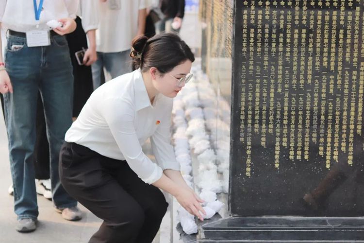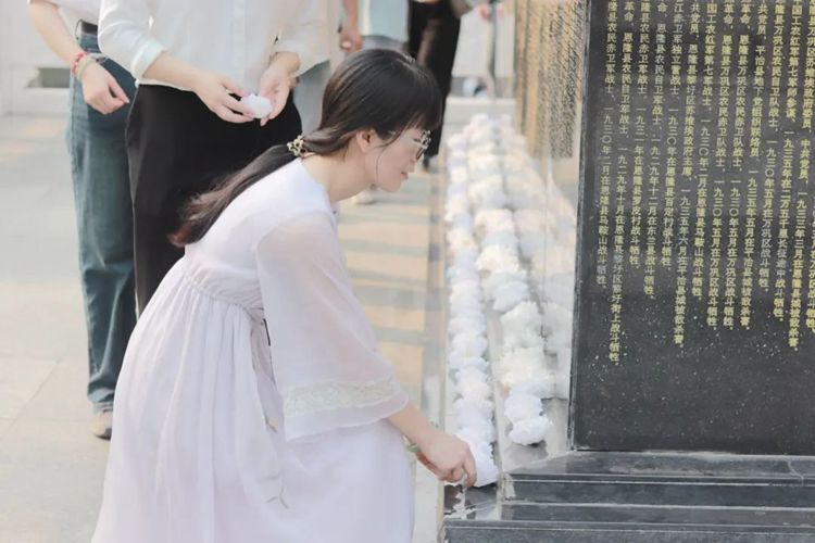 全体师生依次走上瞻仰台,向革命先烈敬献小白花