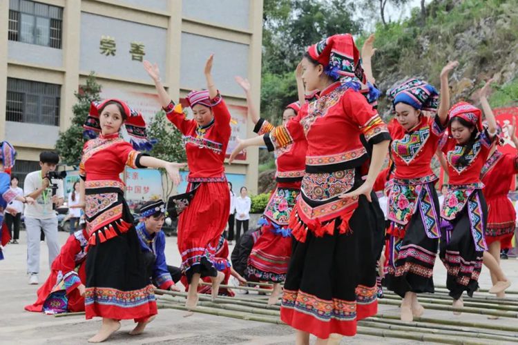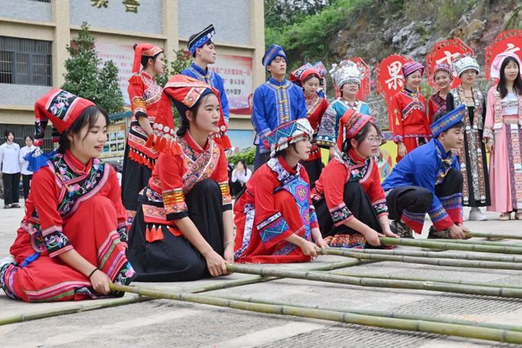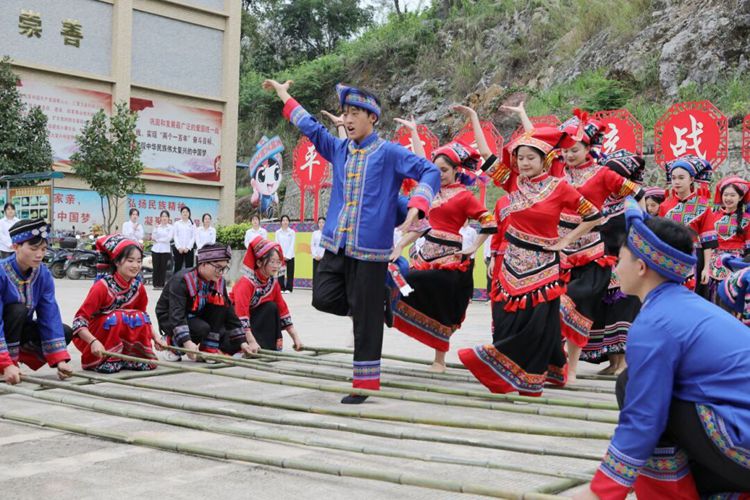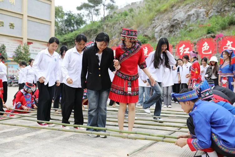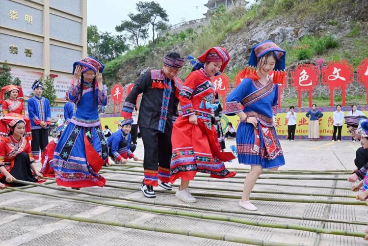 在轻快的竹竿敲击节奏中,师生们身着美丽的民族服饰,跳起欢乐的竹竿舞。