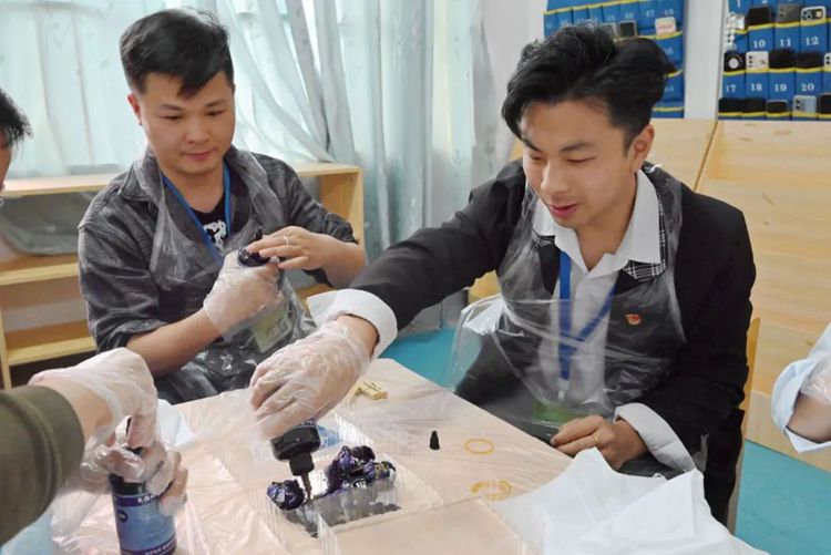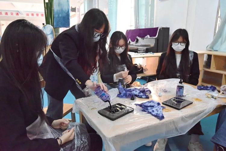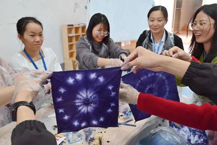 扎染工艺分为扎结和染色两部分,学生们用纱线、皮筋将棉布捆扎成不同的花纹,浸入染料中,通过不同的着色、脱色,形成层次丰富、令人惊叹的色晕和图案。