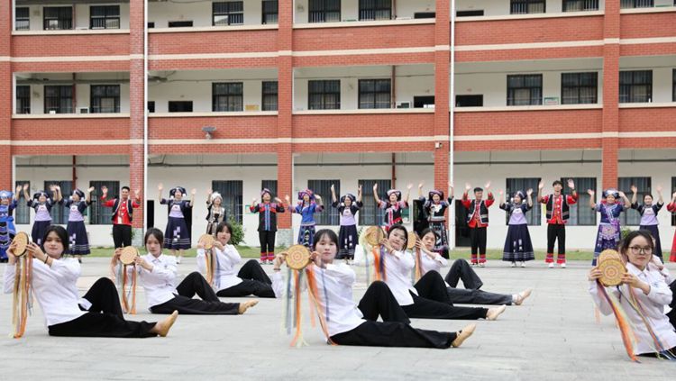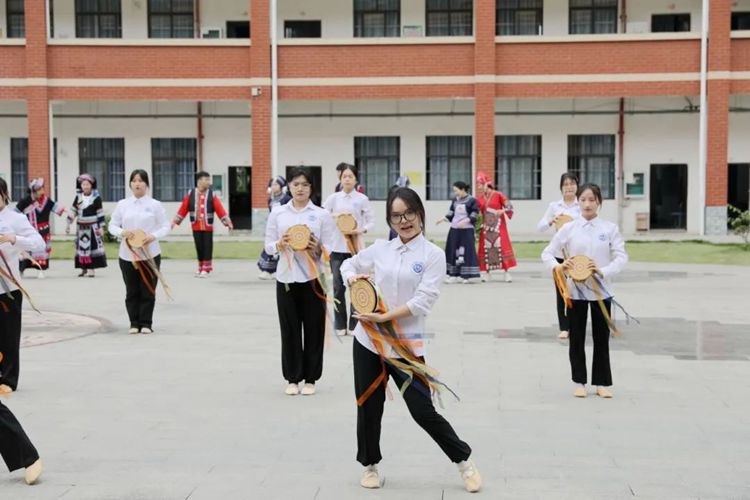 在学校教学区小广场,莲鼓越歌行的舞者们手持鼓棒和莲花,配合鼓声和歌曲的旋律,跳跃着独特的舞步,展示出优美、热烈、充满活力的舞蹈文化。