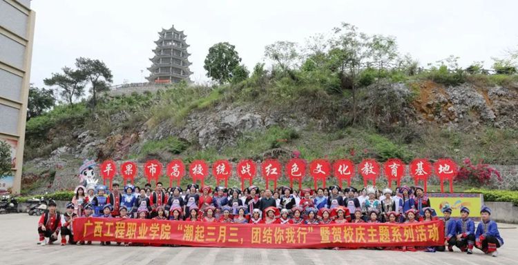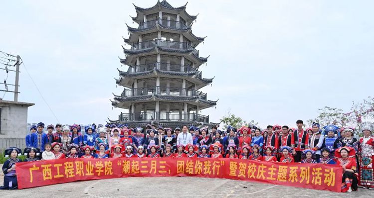4月9日,学校师生身穿民族服饰,相聚工程塔,唱山歌,抛绣球,感受多彩民族风情,同庆“广西三月三”民族传统节日。党委书记、督导专员蒙本曼等校领导参加了活动。