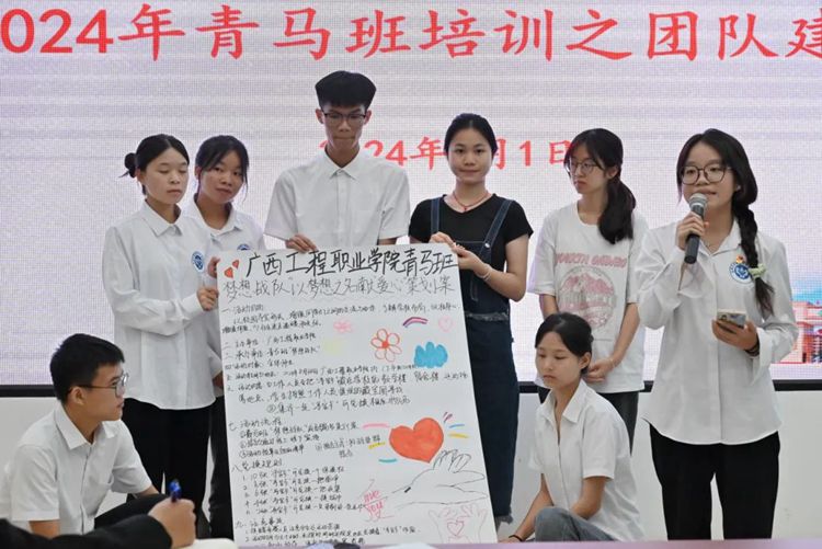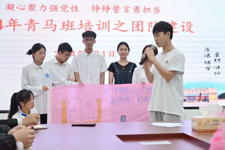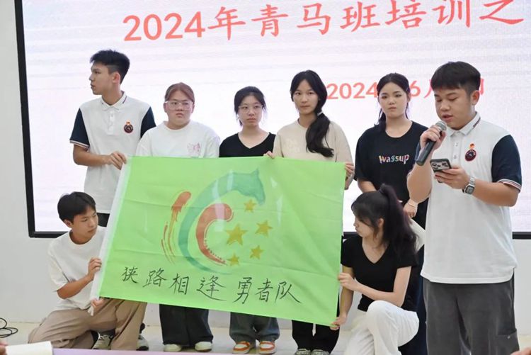 在团队建设活动中,青马班学员们以10名同学为一小组,互不认识的小组成员迅速行动起来,推选小组长,并团结协作,集思广益,短时间内就想好了小组的队名、队歌、团队口号等。在小组展示的过程中,各个小组发挥自身优势,展示了别具特色的团队文化。