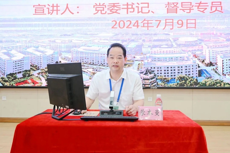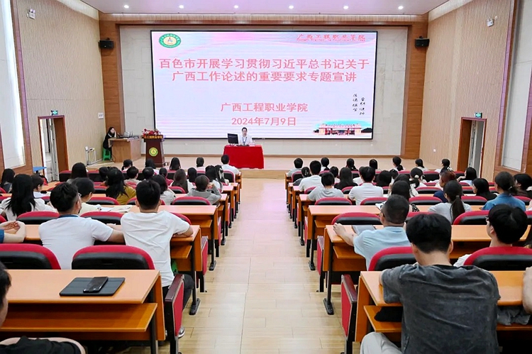 2024年7月9日,学校党委在图文信息大楼一楼学术报告厅举行学习贯彻习近平总书记关于广西工作论述的重要要求专题宣讲会,全体教职员工参加宣讲会,党委书记、督导专员蒙本曼作专题宣讲。