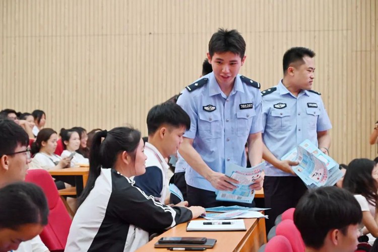 蒋奇志警官围绕什么是电信网络诈骗、电信网络诈骗的犯罪特点、与校园相关的电信诈骗案例、常见电信诈骗类型分析及防范等方面,通过详实的案例分析、逼真的情景模拟等形式,全面揭示了各类诈骗的惯用手法和特点。同时,对网络诈骗、电话诈骗等常见诈骗类型进行了重点解读,传授了一系列实用的防范技巧,引导师生们在实际生活中运用所学知识,增强自我保护能力。平果市马头镇派出所警官向学生发放电信网络防范知识手册。