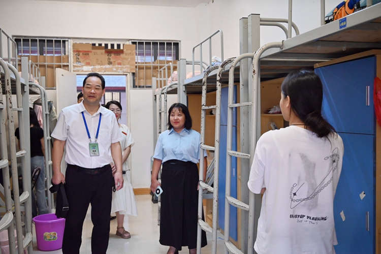 图为学校领导到学生公寓与新生亲切交流
