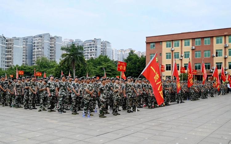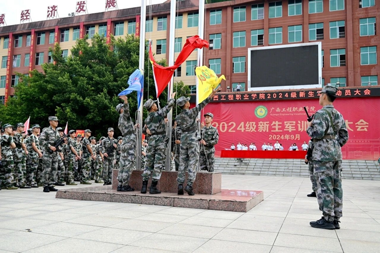 伴随着庄严激昂的国歌,五星红旗冉冉升起。全体师生面向国旗肃立敬礼,军训动员大会拉开序幕。