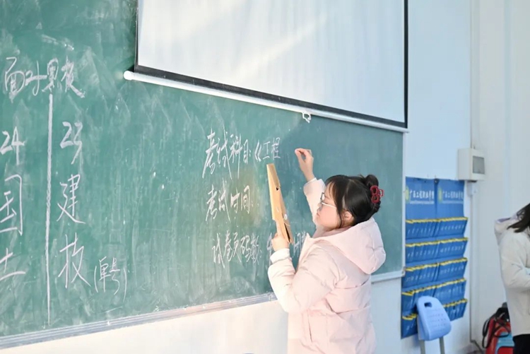 图为监考教师将考试科目、考试时间和试卷页码书写到黑板上