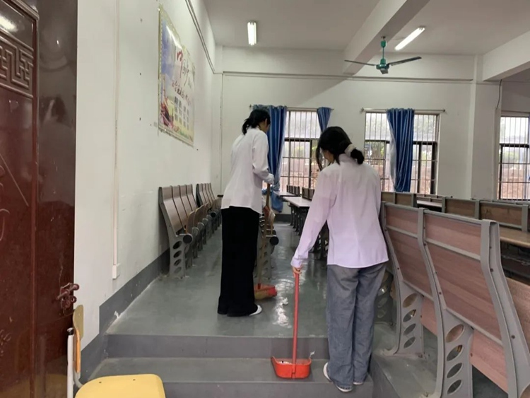 在教学楼里,志愿者们仔细清扫楼梯和走廊,确保每一处角落都干净整洁。
