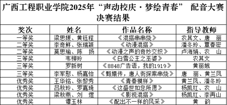 本次“声动校庆·梦绘青春”配音大赛,为学生们提供了一个展示自我、锻炼能力的平台。这场视听盛宴不仅让广工程院学子在聚光灯下绽放个性光彩,更以声音为媒介,编织出对学校十八载峥嵘岁月的深情礼赞,为校庆画卷添上了充满青春力量的绚丽注脚。