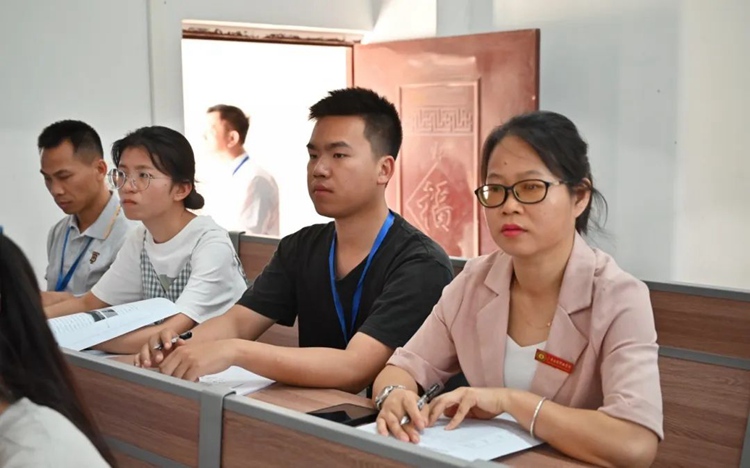 图为学校党委书记、督导专员蒙本曼认真聆听