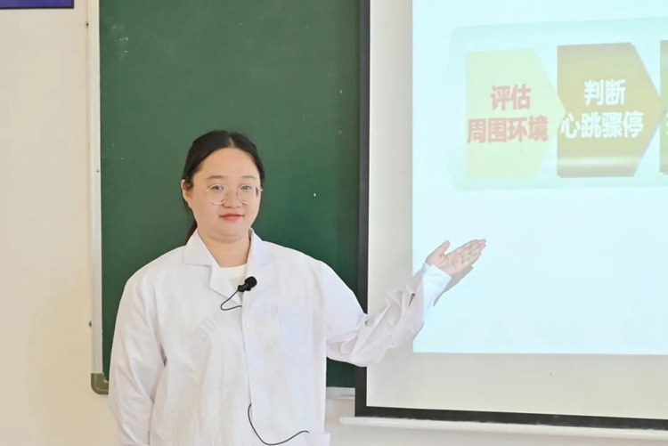 黄雯老师向同学们详细讲解了心肺复苏术的急救知识,并演示了心肺复苏术急救法的具体操作细节,告诉同学们如何最有效地利用“黄金时间”抢救生命,进一步提升了同学们的紧急救护能力。