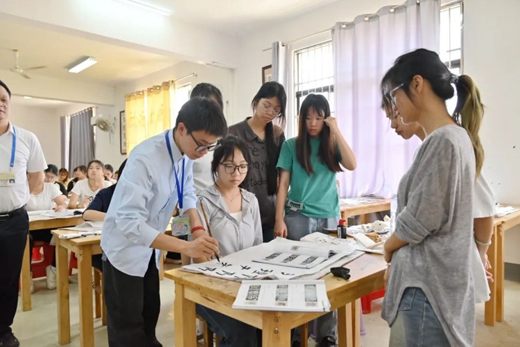 在韦国庆老师的指导下,学生从执笔入手,掌握书写技巧,体会单字结构与整体布局之美。传统书法与现代教学结合,既提升学生书写能力,也让书法艺术在课堂焕发生机。