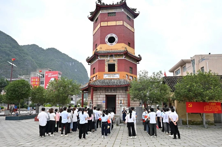 讲解员给党员们详细讲述了魁星楼建设的坎坷历史,以及邓小平、张云逸和韦拔群等先辈们在魁星楼内指挥东兰人民开展武装革命的伟大功勋。