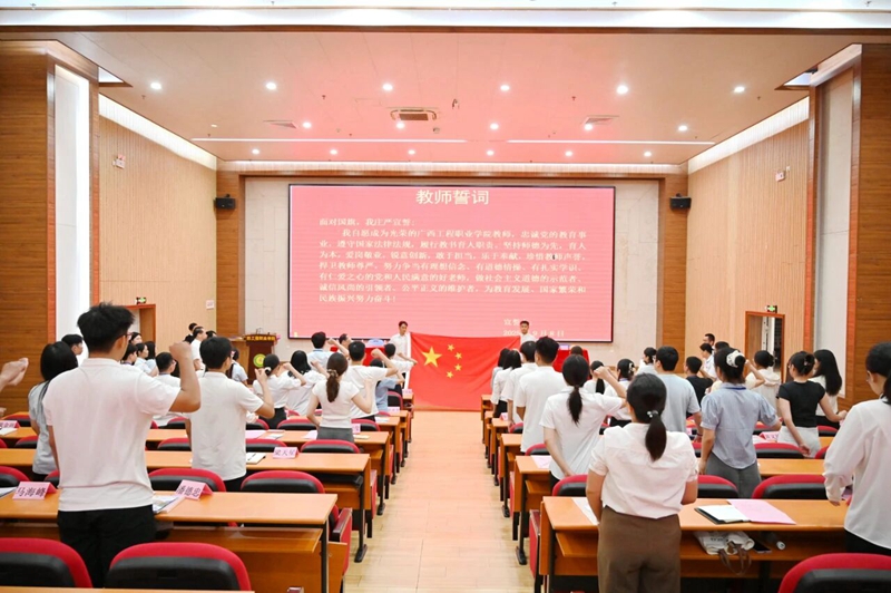 全体新任教师在副校长黄德伟的领誓下,面向国旗庄严进行入职宣誓。新教师们身姿挺拔、神情肃穆,右手握拳高举,以铿锵有力的誓言作出职业承诺。激昂的誓言回荡会场,充分彰显了新教师对党的教育事业的绝对忠诚,以及对教书育人职责的坚定坚守,进一步增强了其职业荣誉感、政治责任感与使命担当感。