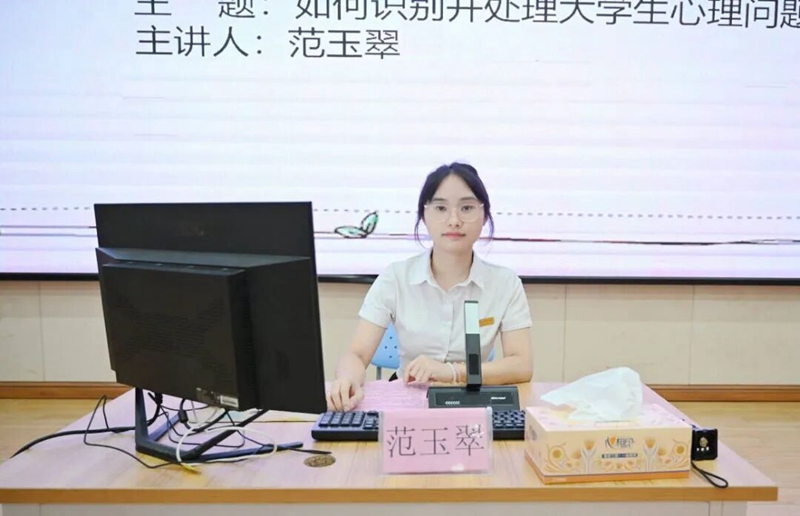 图为学生工作处科长范玉翠作大学生心理健康问题专题培训
