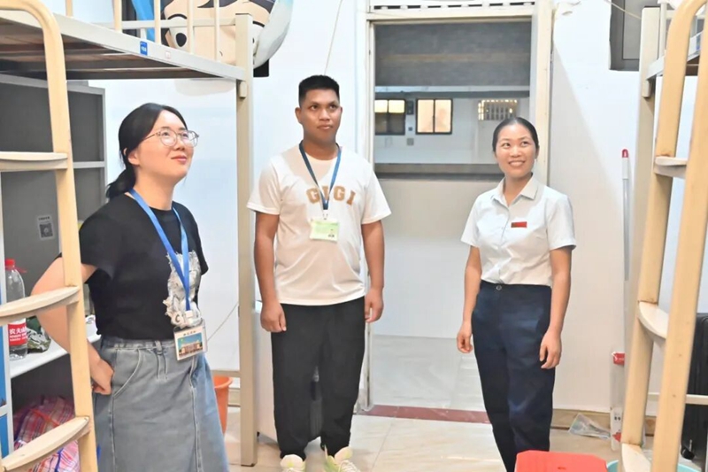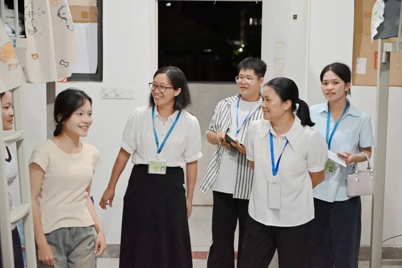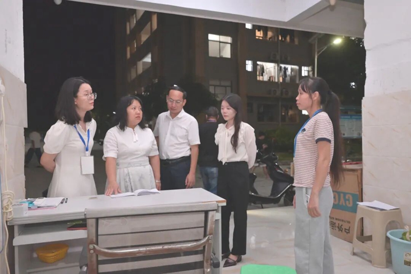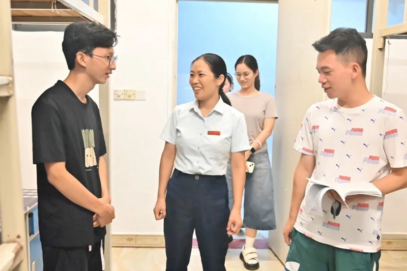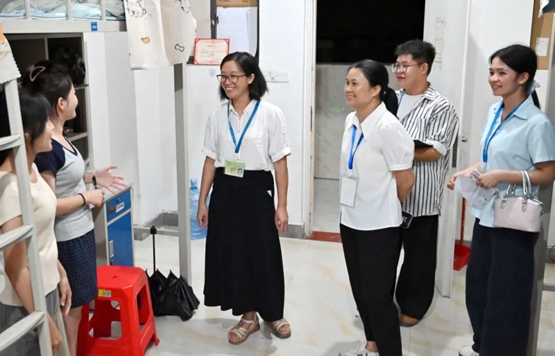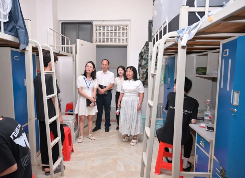 图为学校党委副书记、校长罗艳妮、副校长黄德伟深入学生宿舍,与同学们面对面交流