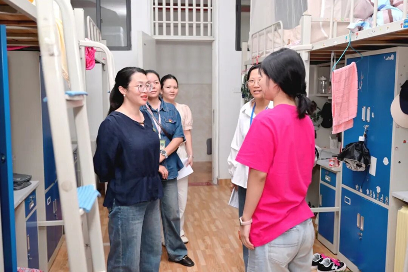 图为学校副校长蒋茂丽走访学生宿舍与学生交流