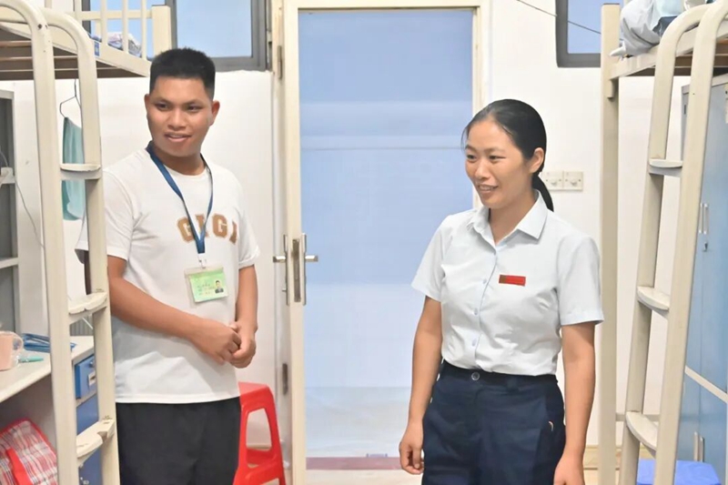 图为学校党委副书记黄秋霞走进学生宿舍与学生交谈