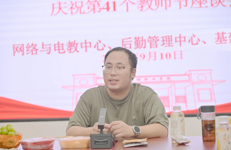 图为校长助理李明泽组织网络与电教中心、后勤管理中心、基建处等部门召开庆祝第41个教师节座谈会