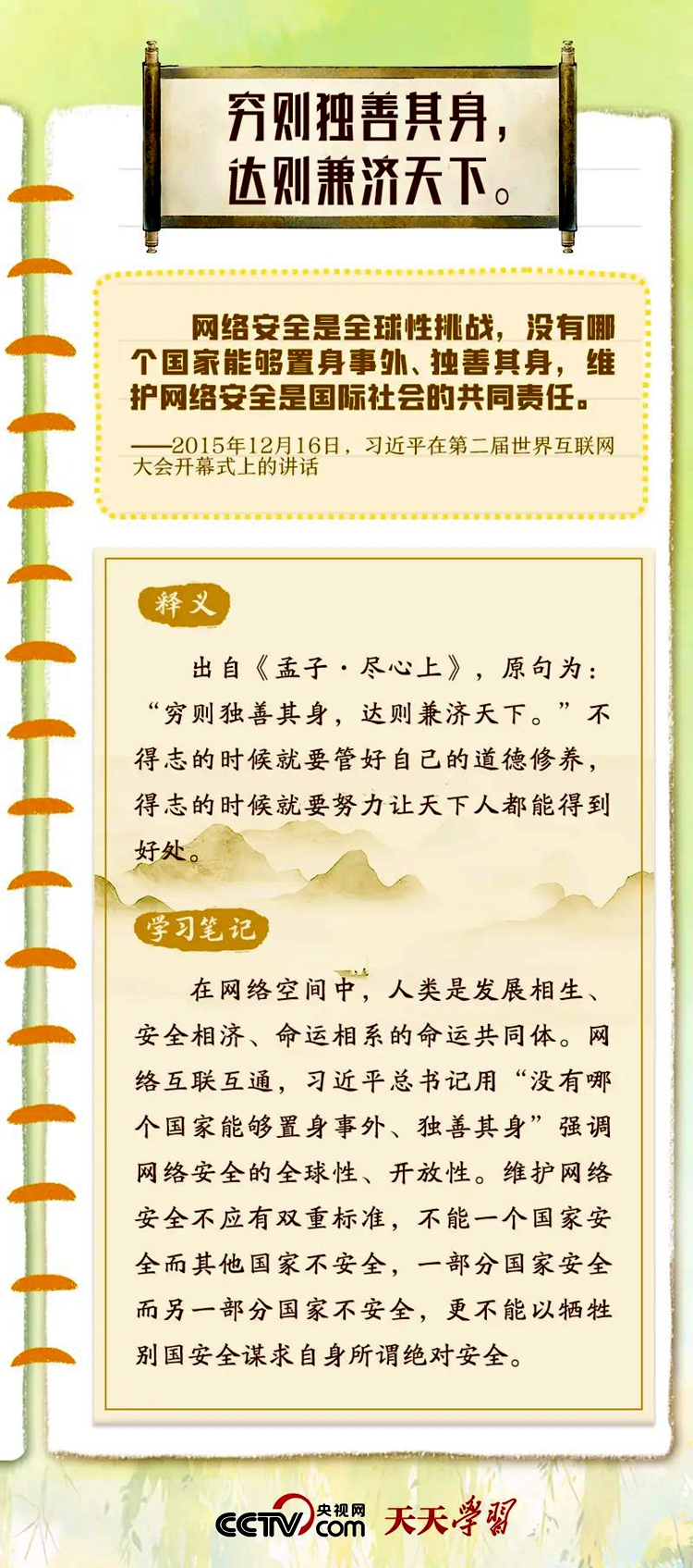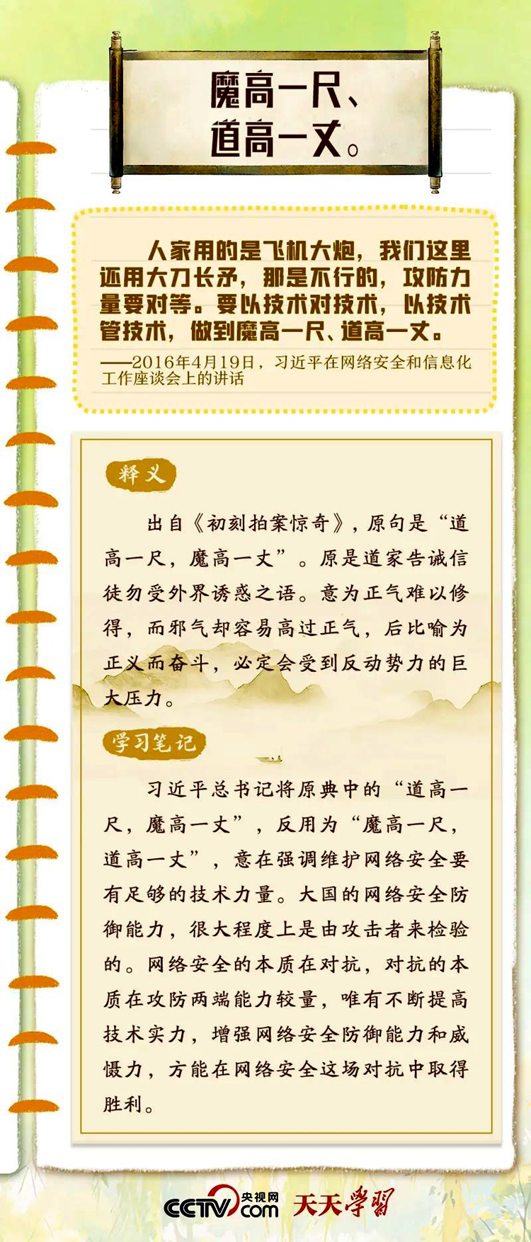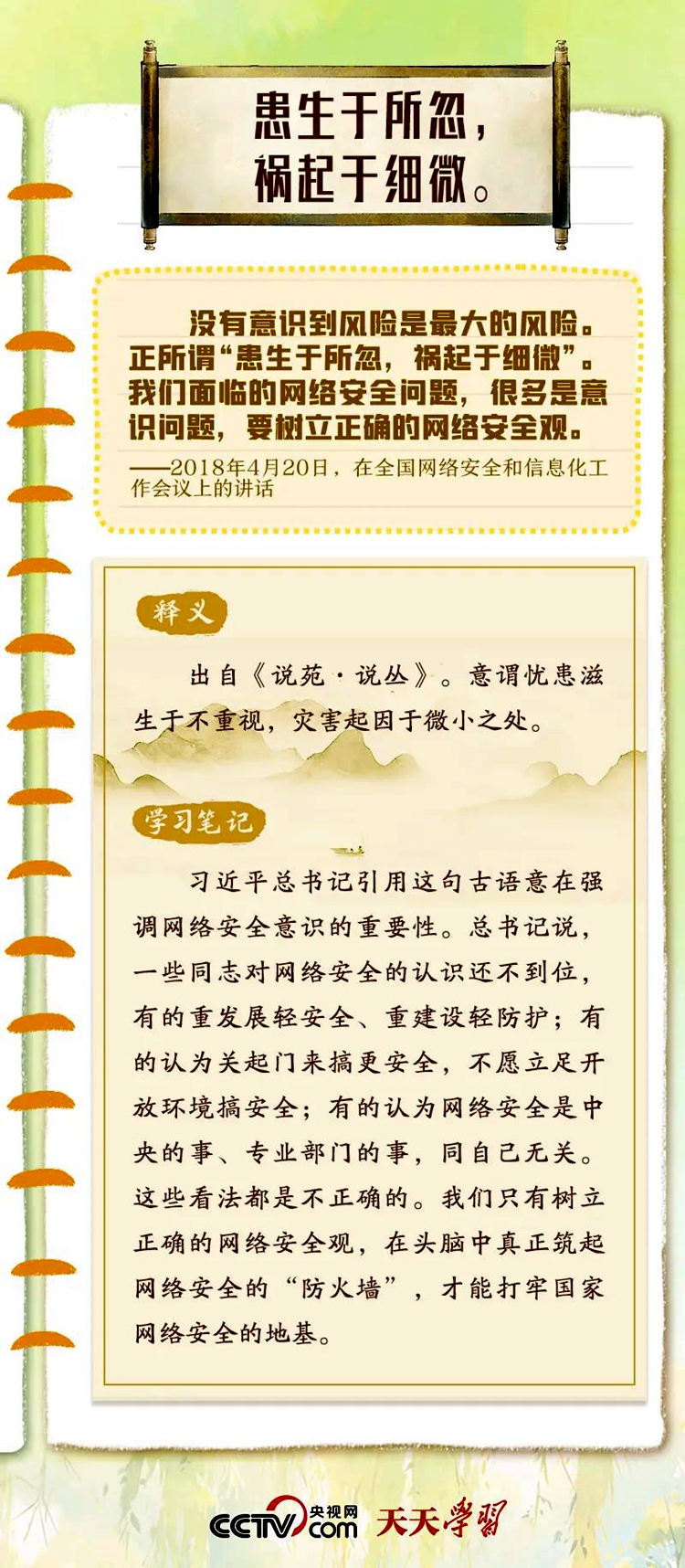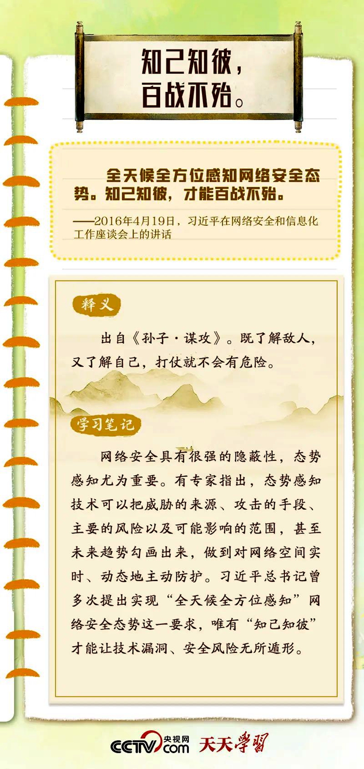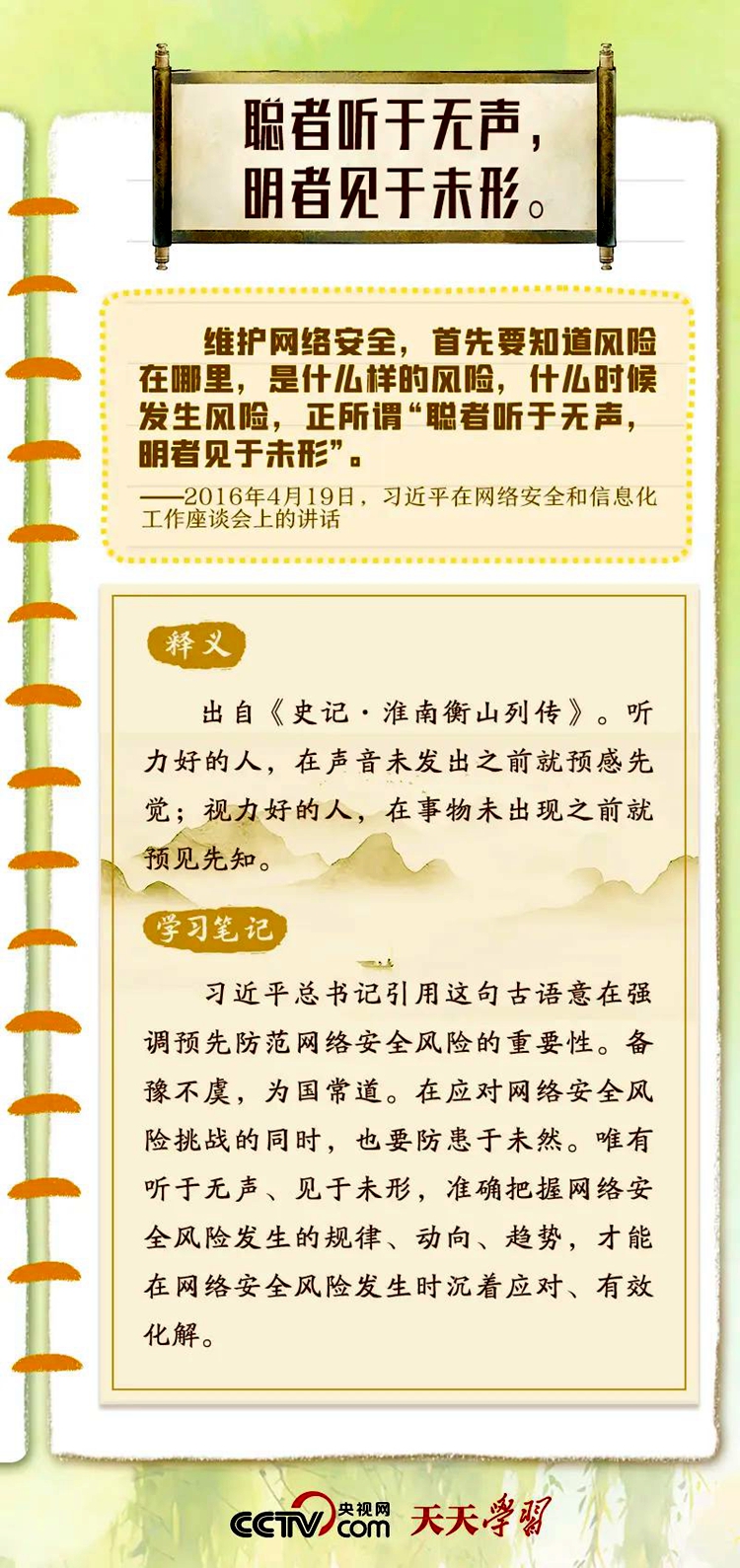 习近平总书记重视网络安全工作,曾多次在讲话中以典明理,深刻阐释网络安全工作的重要意义。“网络安全宣传周”到来之际,央视网《天天学习》特梳理总书记关于网络安全的用典,与您一起学习领悟。