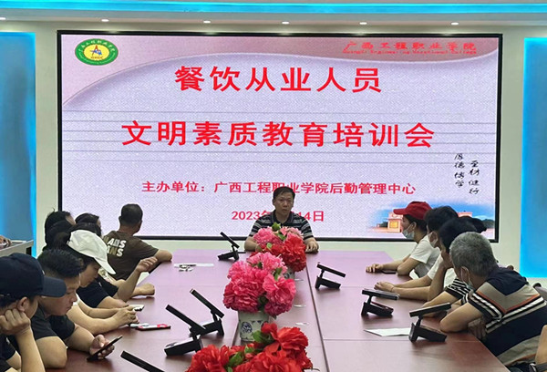 为进一步加强餐饮从业人员对学校的归宿感、认同感,提高学校餐饮服务质量,改善后勤服务形象,确保学生用餐环境绿色、安全,2023年6月14日后勤管理中心召集所有商铺和食堂工作代表,在图书馆大数据中心进行了餐饮从业人员文明素质教育培训。