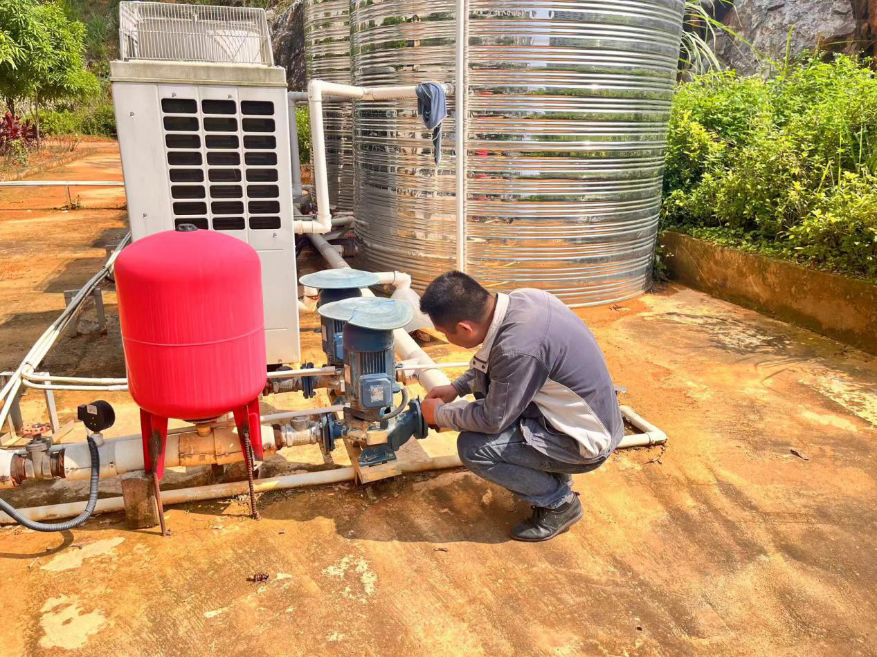 图为电工师傅检查空气能加压泵