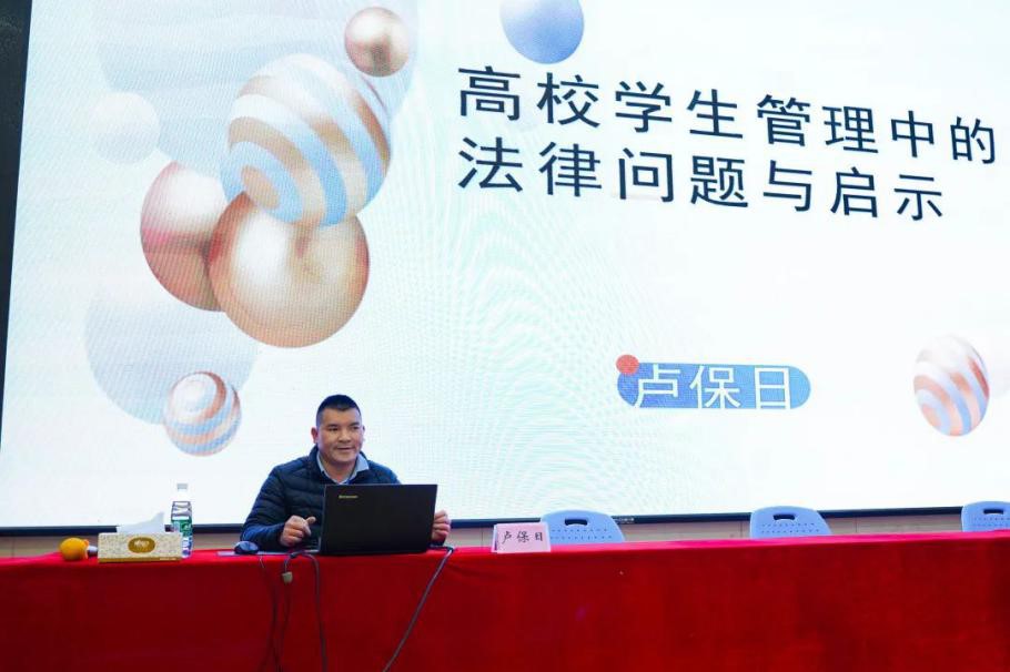 学生工作处处长卢保日作学生工作专题培训,他结合经典案例阐述了如何开展学生管理工作以及危机处置。