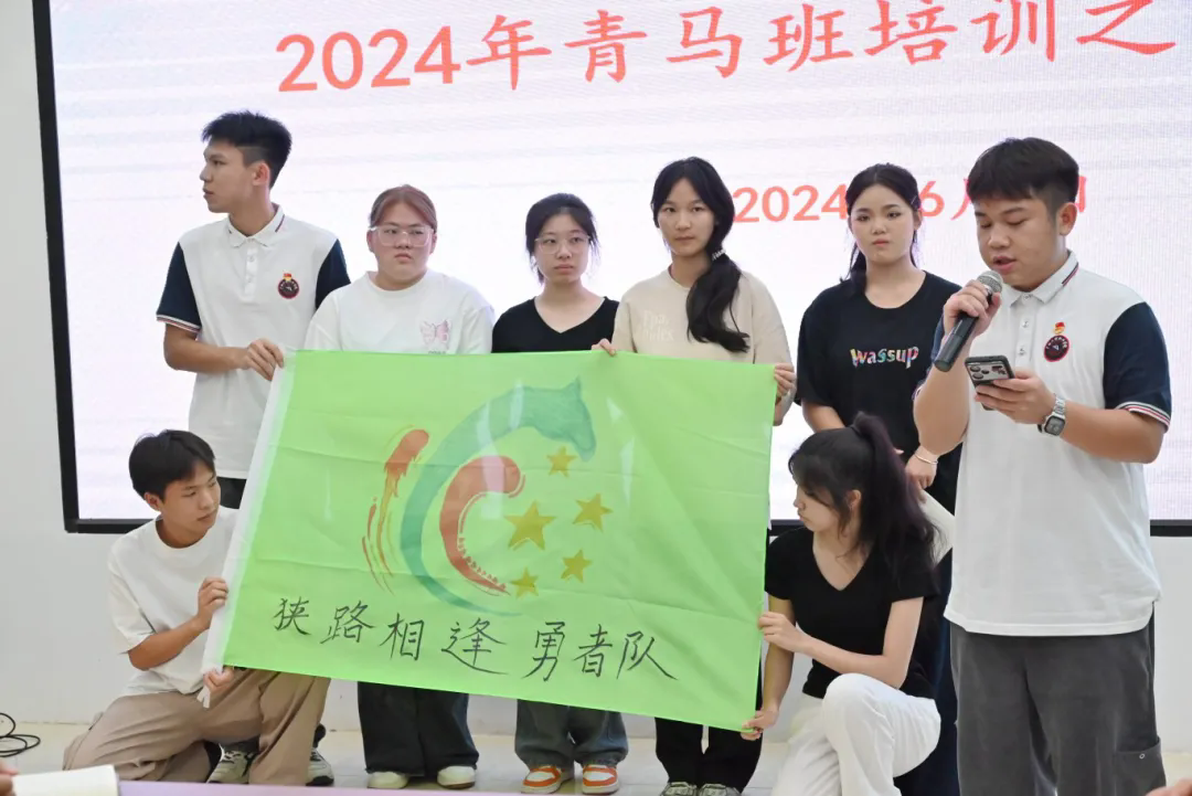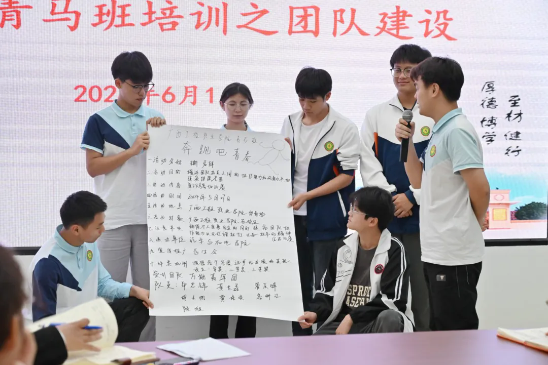 在团队建设活动中,青马班学员们以10名同学为一小组,互不认识的小组成员迅速行动起来,推选小组长,并团结协作,集思广益,短时间内就想好了小组的队名、队歌、团队口号等。在小组展示的过程中,各个小组发挥自身优势,展示了别具特色的团队文化。