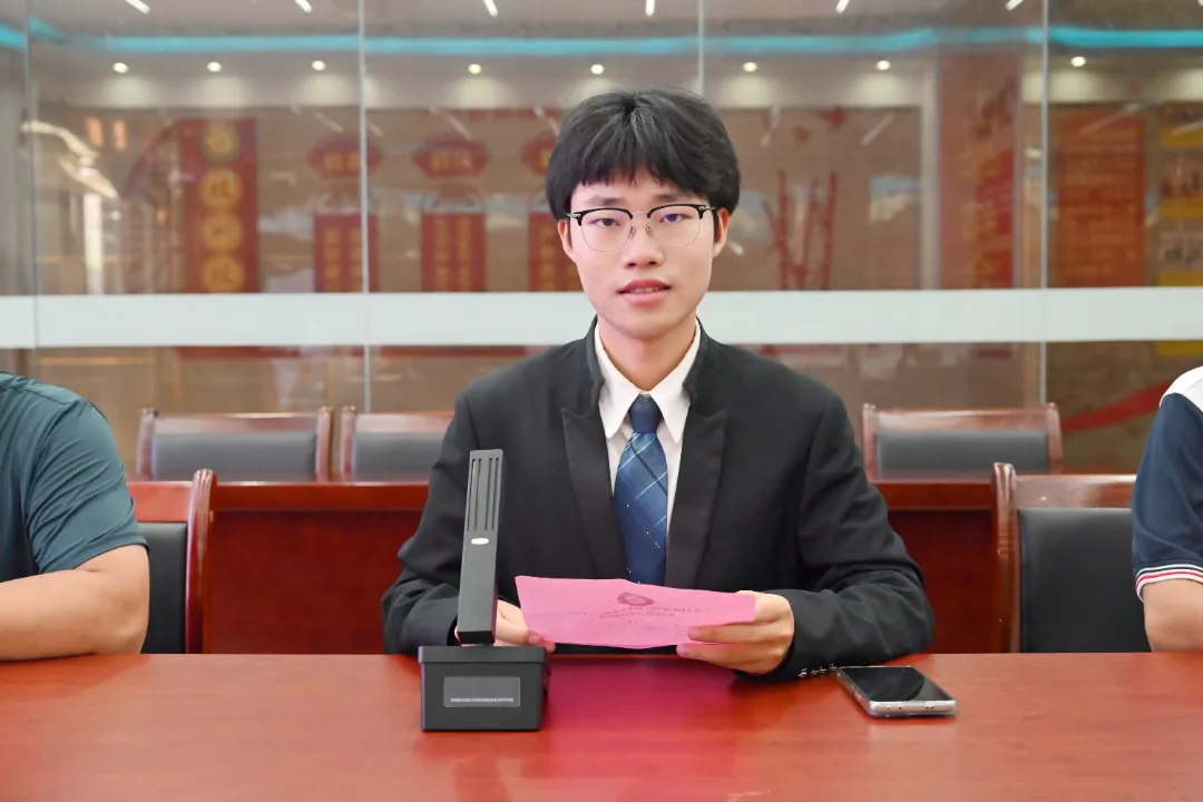 土木工程学院2023级建筑工程技术3班谭书恒同学发言,他表示,作为当代青年大学生,我们是祖国的未来和民族的希望。暑期“三下乡”社会实践活动,是我们大学生深入农村、服务群众、奉献社会的重要平台。这不仅是一次社会实践,更是一次心灵的洗礼和成长的磨砺。通过这次活动,我们将走出校园,走进农村,用我们的知识和热情,为农村的发展贡献一份力量。我们要以积极的态度,投入到这次活动中去,发挥我们的专业优势,开展丰富多彩的志愿服务活动,在农村基层展现青春风采,为助力乡村振兴奉献青春、智慧和力量。