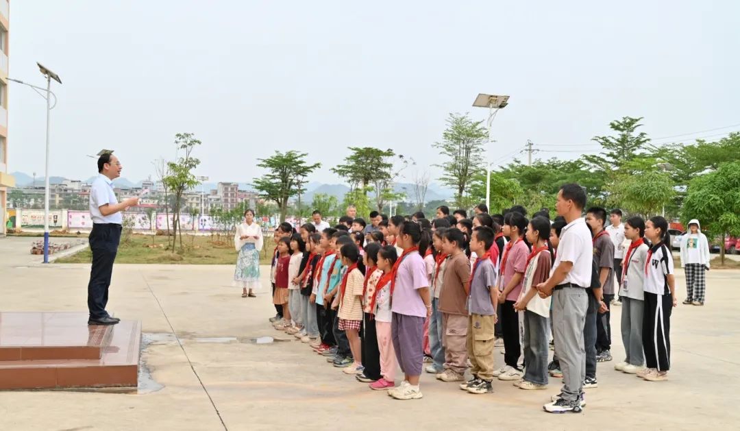 学校副校长黄德伟讲话。他表示,此次捐赠不仅是物资帮扶,更是精神传承,这些饱含温度的红色读物和学习用品,让革命精神在新时代少年心中生根发芽。他对同学们提出了三点希望: