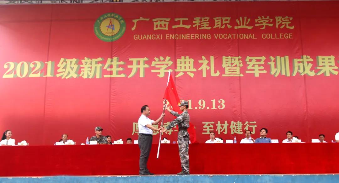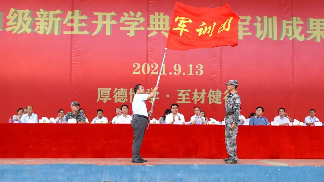 最后,广西绿盾国防教育基地总教官唐森林向学校纪委书记李益转交军训团团旗,beat365唯一官网2021级新生开学典礼暨军训成果汇报会圆满结束。