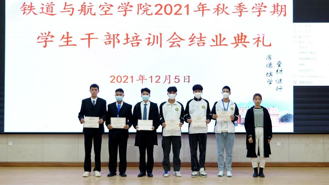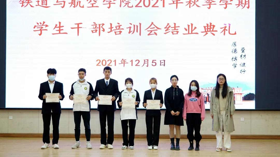 2021年秋季学期“明责任•增才干•做精英干部”培训班培训结束后,铁道与航空学院举行了结业典礼,出席典礼的老师为参训学生干部代表颁发了结业证书。