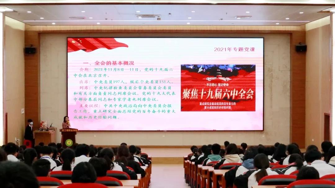 会上,黄秋霞助理主要从六中全会的基本概况、党的百年奋斗的四个伟大成就、新时代马克思主义中国化的伟大飞跃、党的百年奋斗十大历史经验、总结党的百年奋斗重大成就和历史经验的重大意义、党的十八大以来十三方面的历史性成就、两个确立的决定性意义以及以史为鉴开创未来的重要要求等方面,对党的十九届六中全会精神进行了全面解读和阐释。宏大的历史画卷和生动的讲解,让同学们深受触动和启发。