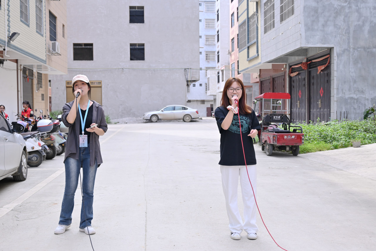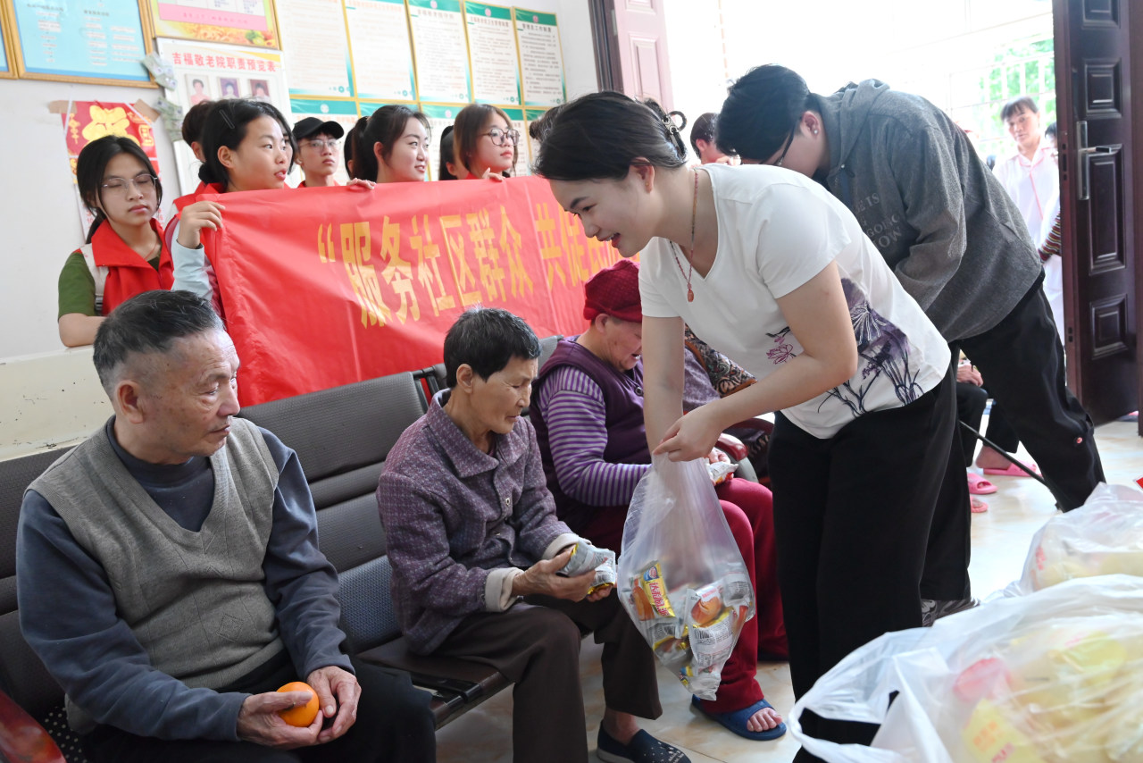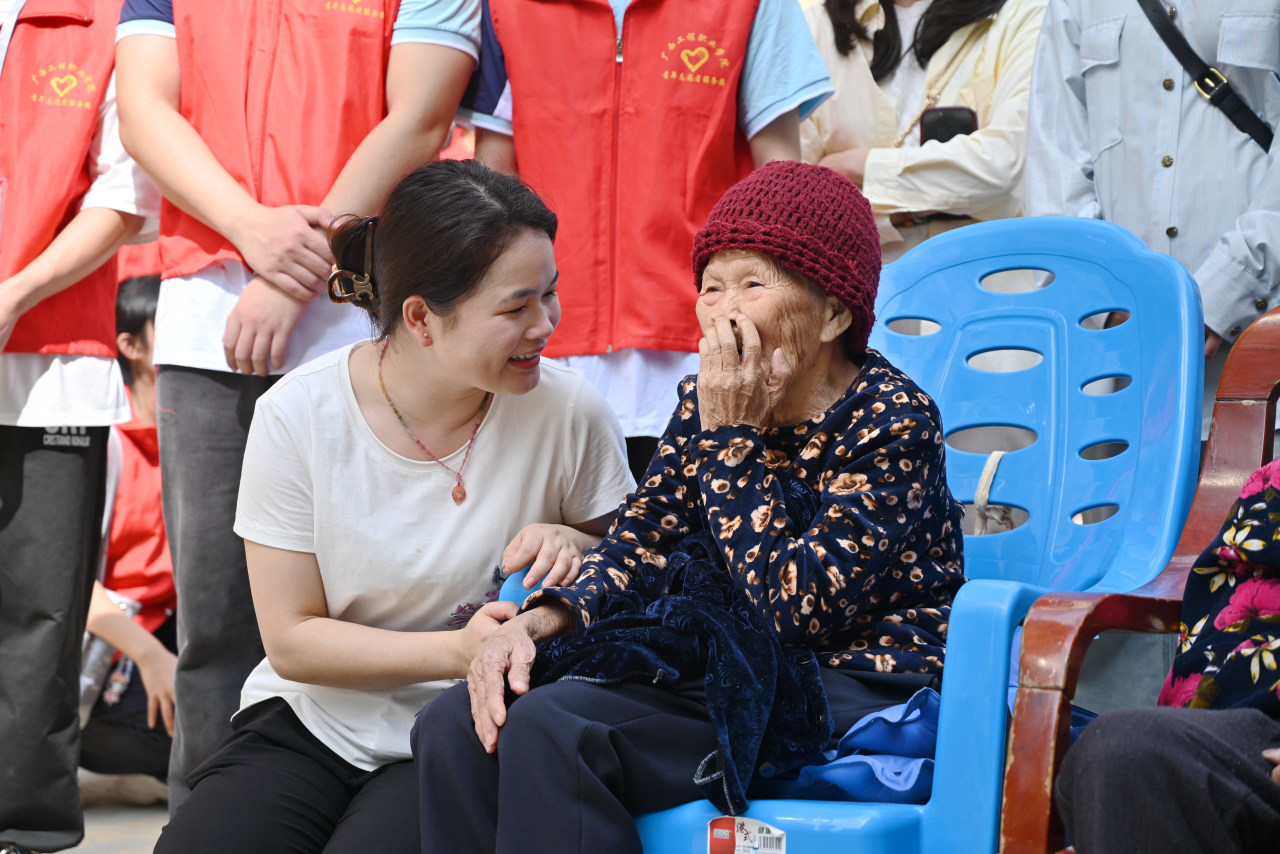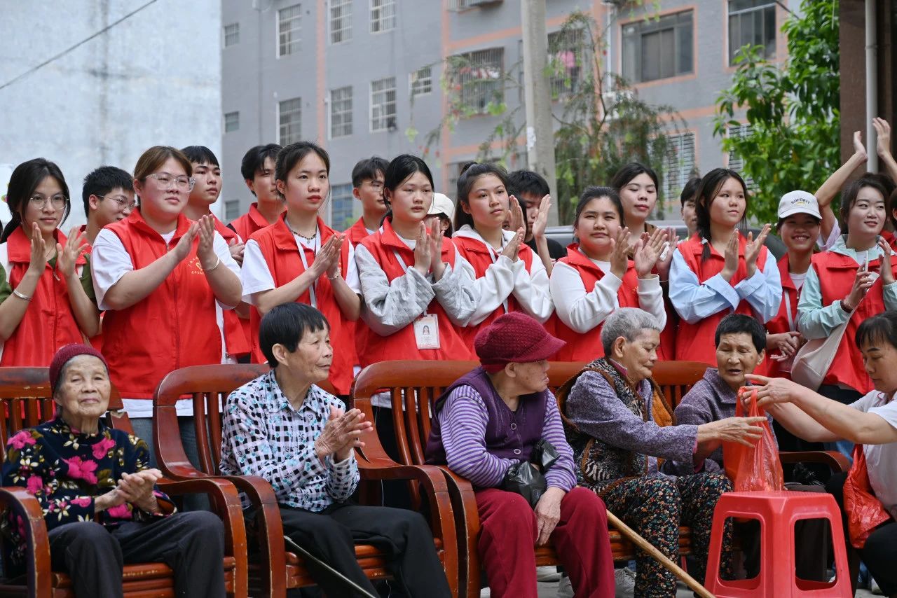 热心的志愿者小心翼翼地把行动不便的老人们搀扶到户外,与他们交流,陪同他们观看同学们精心准备的精彩节目。