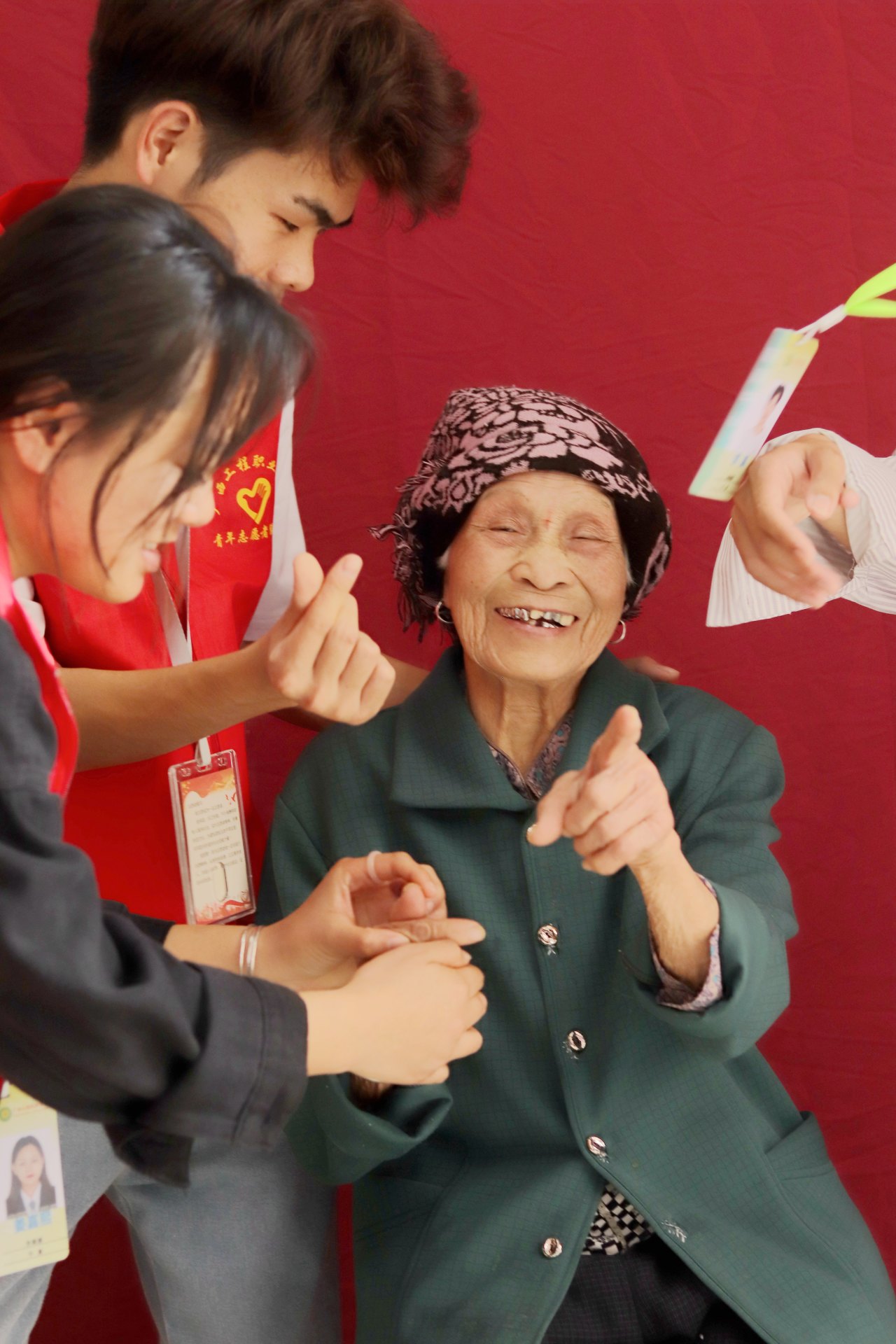 “奶奶看镜头”,“来,奶奶,我们一起比个耶”……