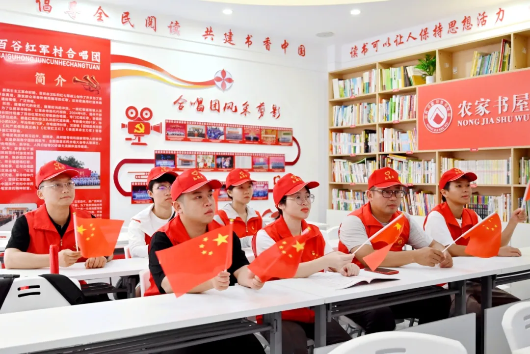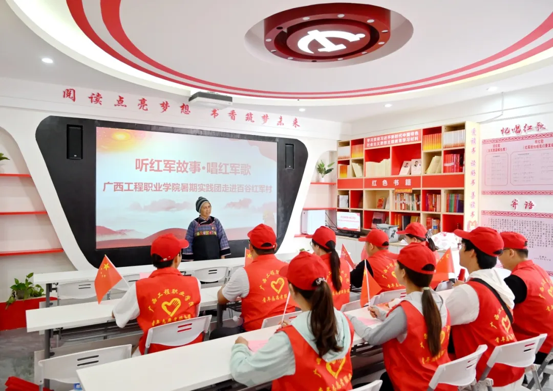 在百谷红军村,百谷红军村革命后代家属带领全体实践团、服务团成员参观了百谷红军村陈列室,她讲解了百谷红军红色革命故事。1929年12月,邓小平、张云逸等无产阶级革命家领导和发动了百色起义,建立红七军和右江苏维埃政权,创建右江革命根据地。百谷村131人参加革命,其中50多人参加红七军和农民协会,为巩固和发展右江革命根据地的建设作出了积极贡献。她将百谷村的历史及百谷村发展现状等向实践团、服务团成员进行了讲解,并深入交流了乡村的文化建设。此外,百谷红军村革命后代家属还带领了全体师生党员齐唱了《红军红又红》《工农革命要团结》《谁是革命主力军》《共产党领导真正确》等红歌。