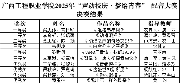 团委副书记李丽清说道,作为新时代青年,你们拥有无限的想象力和表现力。无论是影视配音、动画角色,还是原创作品,都看到你们用声音赋予作品新的生命。通过本次活动,我们广工程院的学子们以声为笔,以情为墨,勾勒出母校十八载的风雨兼程与辉煌成就,用独特的方式诉说着对学校的深厚情谊与美好祝愿,为校庆的壮美画卷添上了一抹最为鲜活的青春亮色。
