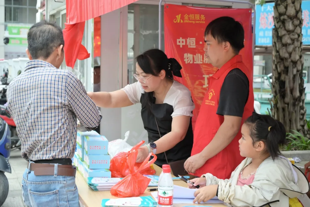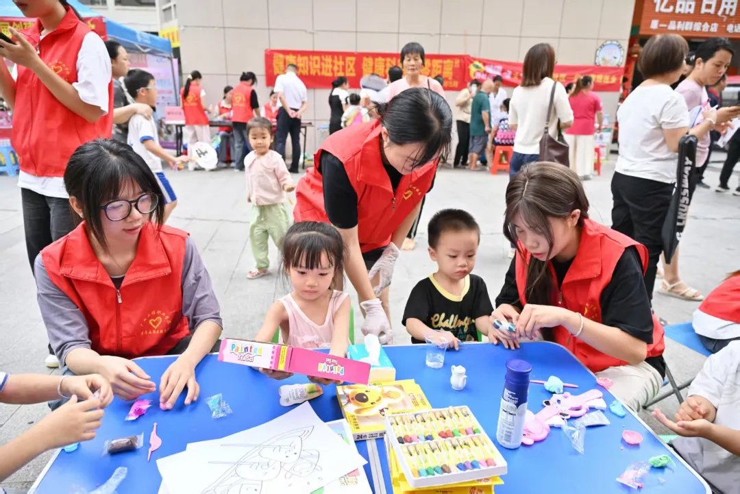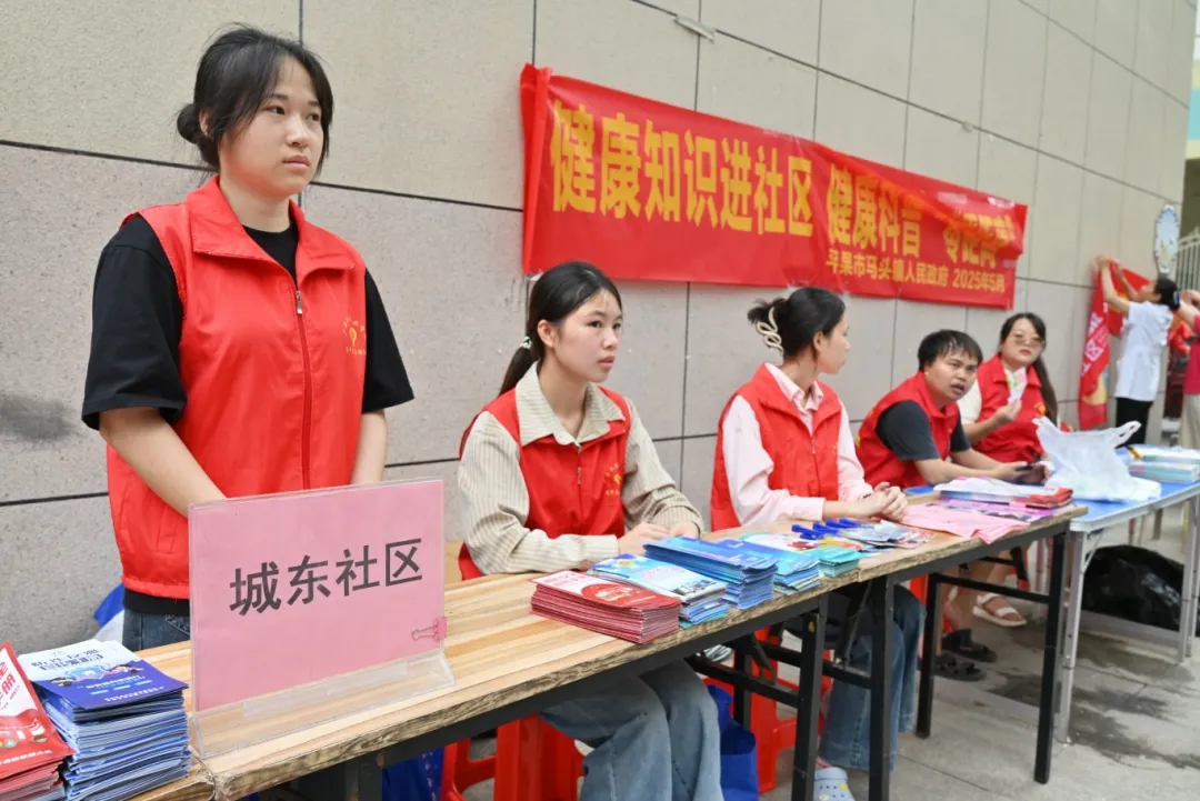 桌上摆放着健康宣传手册,志愿者身着醒目红色马甲,热情满满地为居民们耐心讲解各类健康知识。