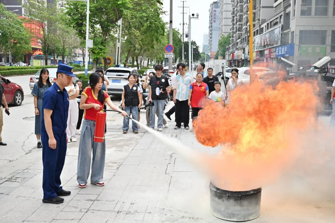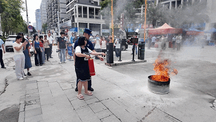 现场还进行了灭火器实操演练,居民们纷纷踊跃参与,在志愿者的指导下,掌握了灭火器的正确使用方法,增强了消防安全意识和自防自救能力。