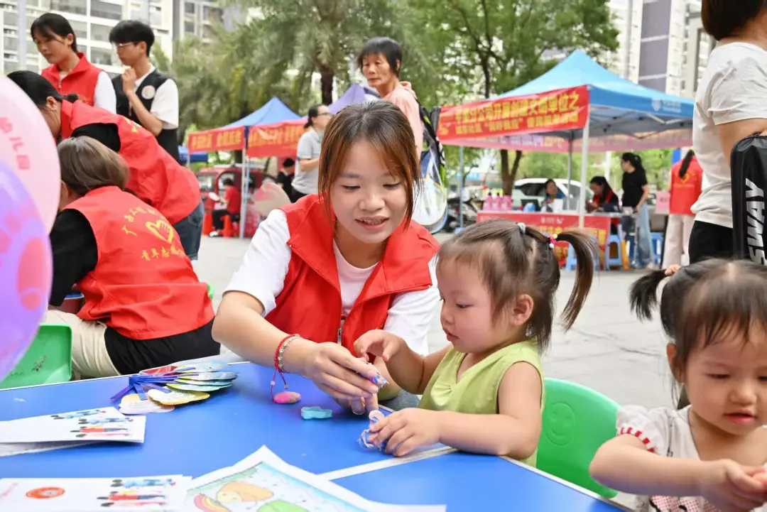 志愿者与小朋友们互动,有说有笑