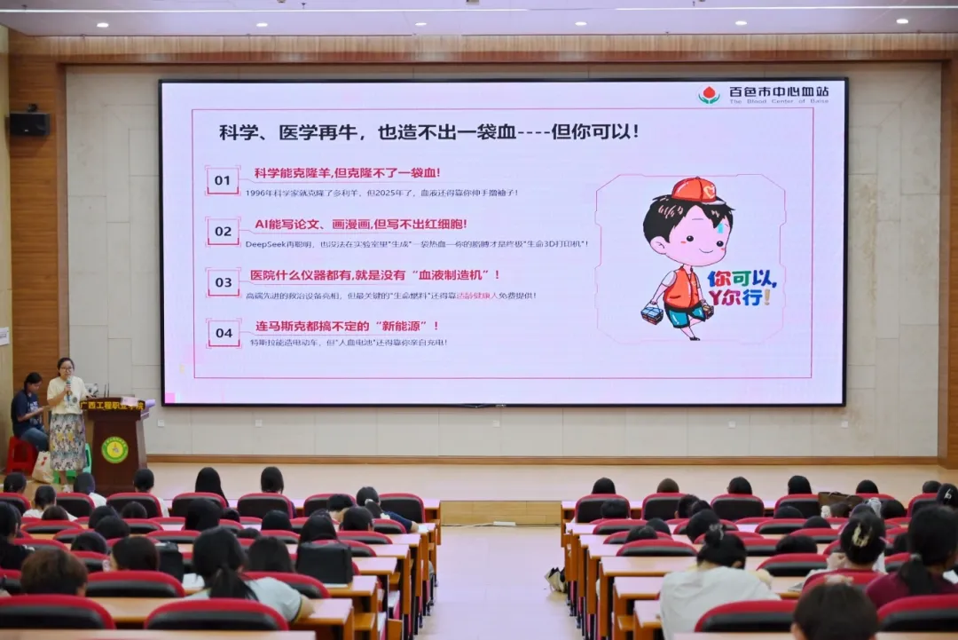 本次宣讲由百色市中心血站献血服务科副科长郑宁主讲。她以“科学与医学的局限性”为切入点,围绕科学能克隆羊,但克隆不了一袋血;AI能写论文、画漫画,但写不出红细胞;医院什么仪器都有,就是没有“血液制造机”;连马斯克都搞不定的“兴能源”等主要内容来宣讲。