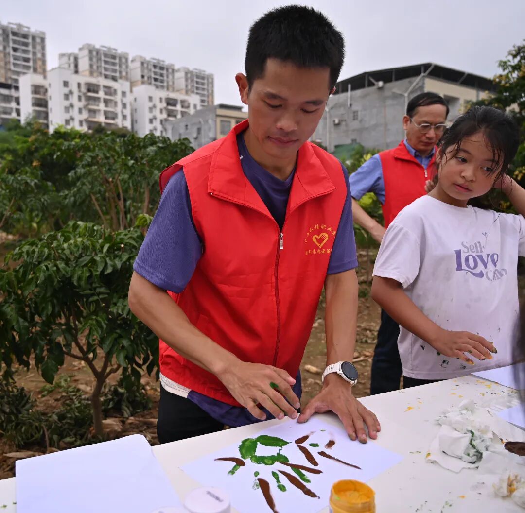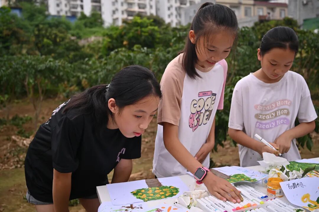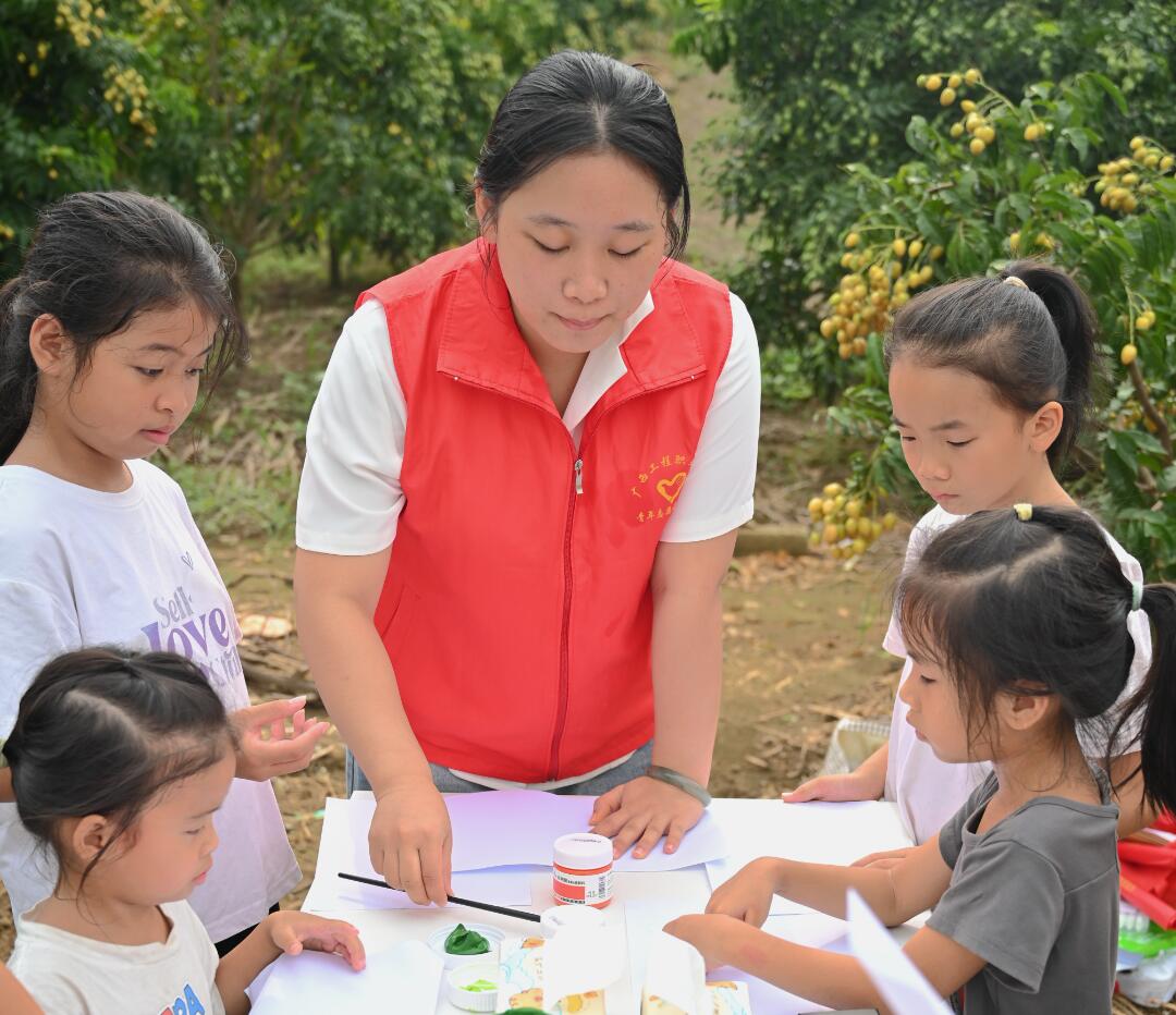 在飘香的果园里,志愿者们和孩子们并肩而立,以枝叶为幕、大地为台,大家拿起画笔,把饱满多汁的黄皮果,生动地渲染到纸上,有的勾勒黄皮果圆润轮廓,有的添上绿叶衬果香,用色彩定格果实的甜与乡村的美。