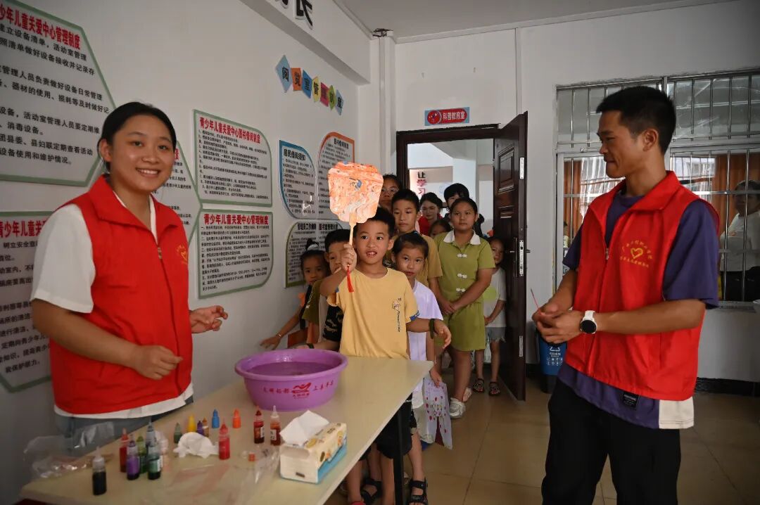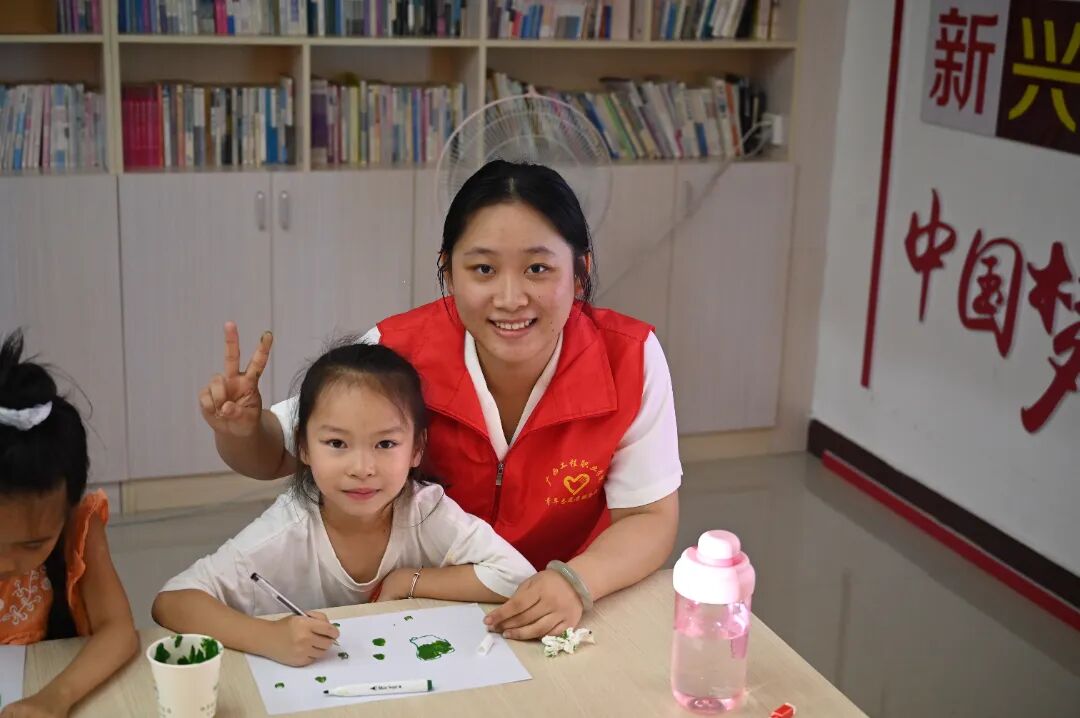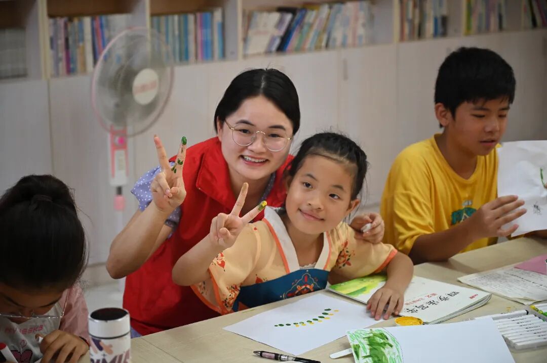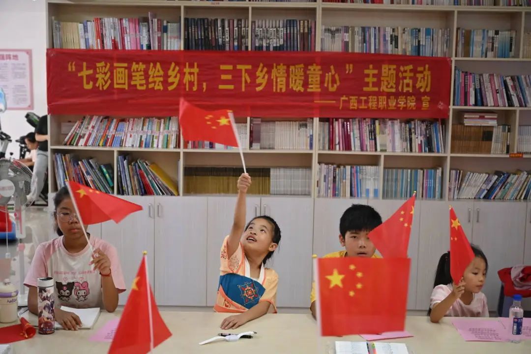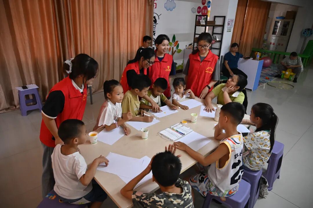 在绘画课堂上,实践团成员为孩子们准备了丰富的绘画工具,鼓励他们用画笔描绘美好的祖国。