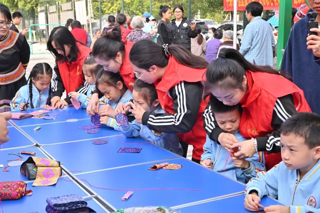 在非遗文化体验区的长桌上,摆放着各类布料及各色丝线、针插。志愿者手把手耐心教孩子们穿针引线,指导平针缝制技巧;站在一旁的老人也主动提供帮助。孩子们小心翼翼地坚持制作,最终完成略显稚嫩却可爱的布艺作品。