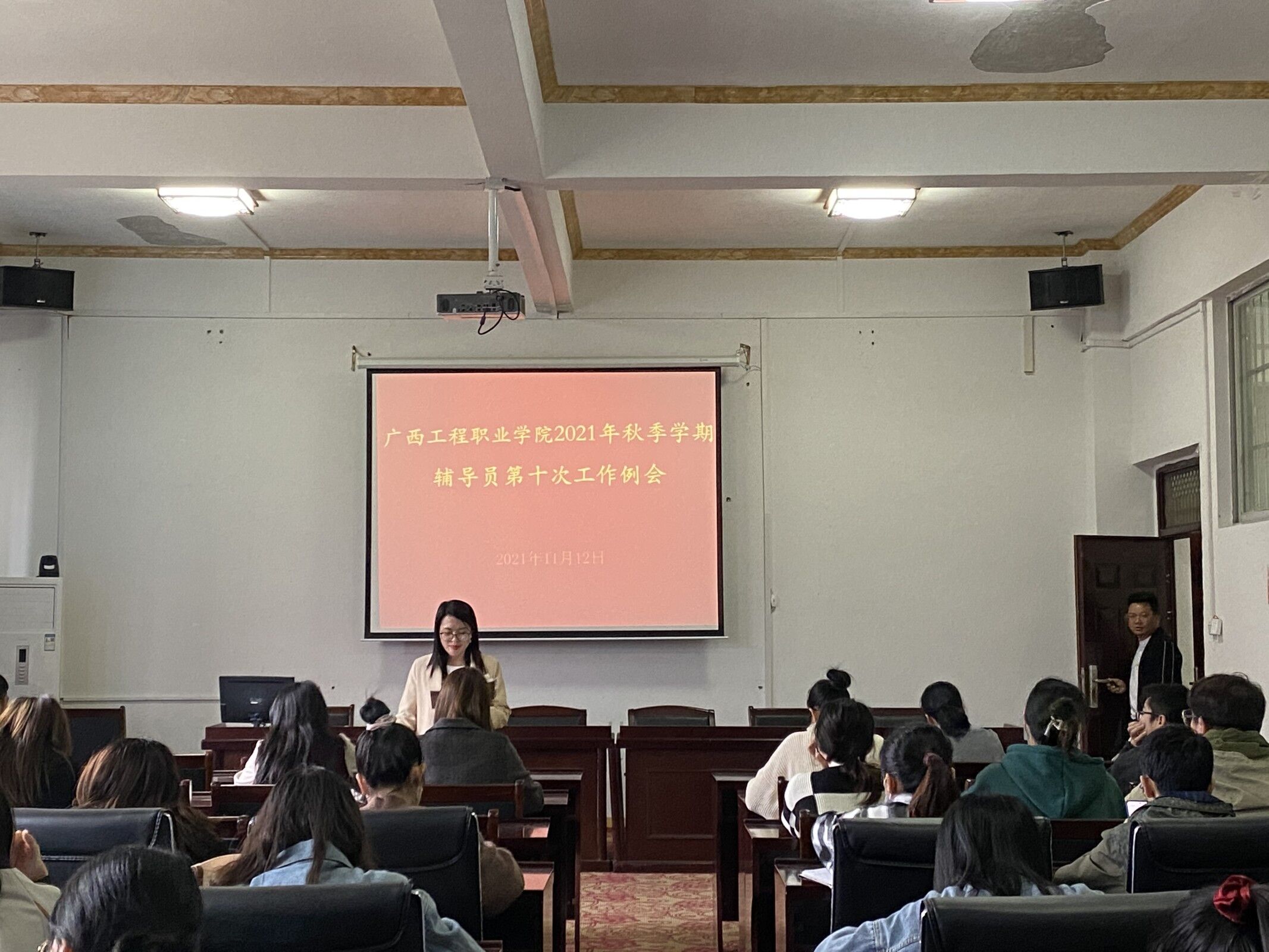 2021年11月12日,学生工作处在旧图书馆学术报告厅召开本学期第十次辅导员工作例会,本次会议由校长助理黄秋霞主持,学生工作处全体人员、二级学院负责人、学生科长及全体辅导员参加。