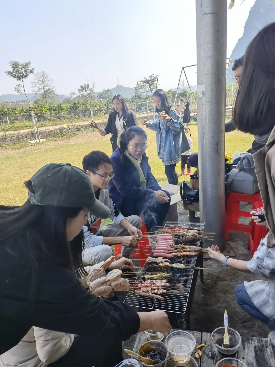 软软的肉串在火苗的“亲吻”下滋滋作响,渐渐地由淡黄色转变为金黄,最后变得焦黄色,色香味俱全,让人垂涎欲滴。在享用美食的同时,欣赏周围的风景,大家一起谈笑风生,围坐在一起,全员参与其中,其乐融融的氛围好不快乐。