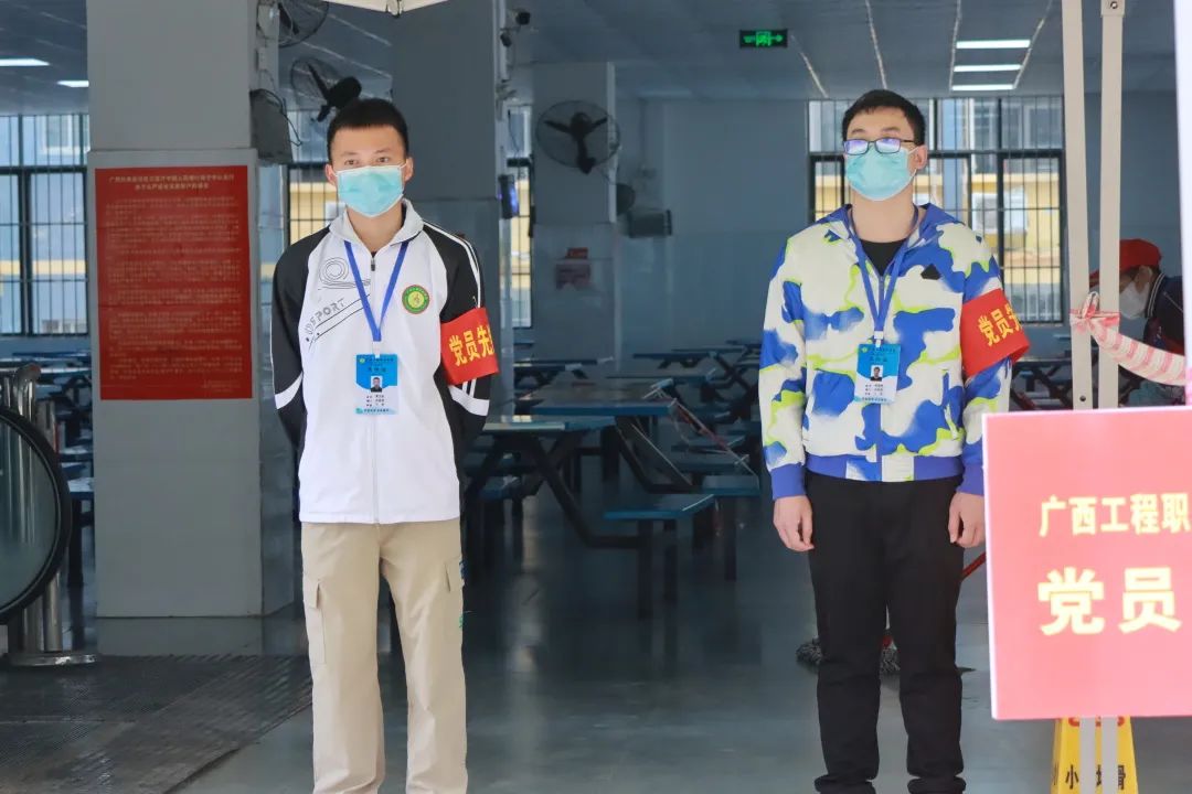 各食堂门口设置党员先锋岗,进行测温等疫情防控工作