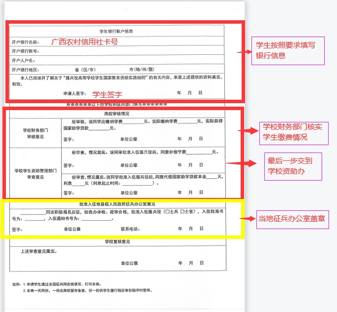 2.《应征入伍服兵役高等学校学生国家教育资助申请表Ⅰ》中的“学生银行账户信息”,提供开户人户名是必须是学生本人,开户银行必须为广西农村信用社,并且确保该卡在3年内都能正常使用。